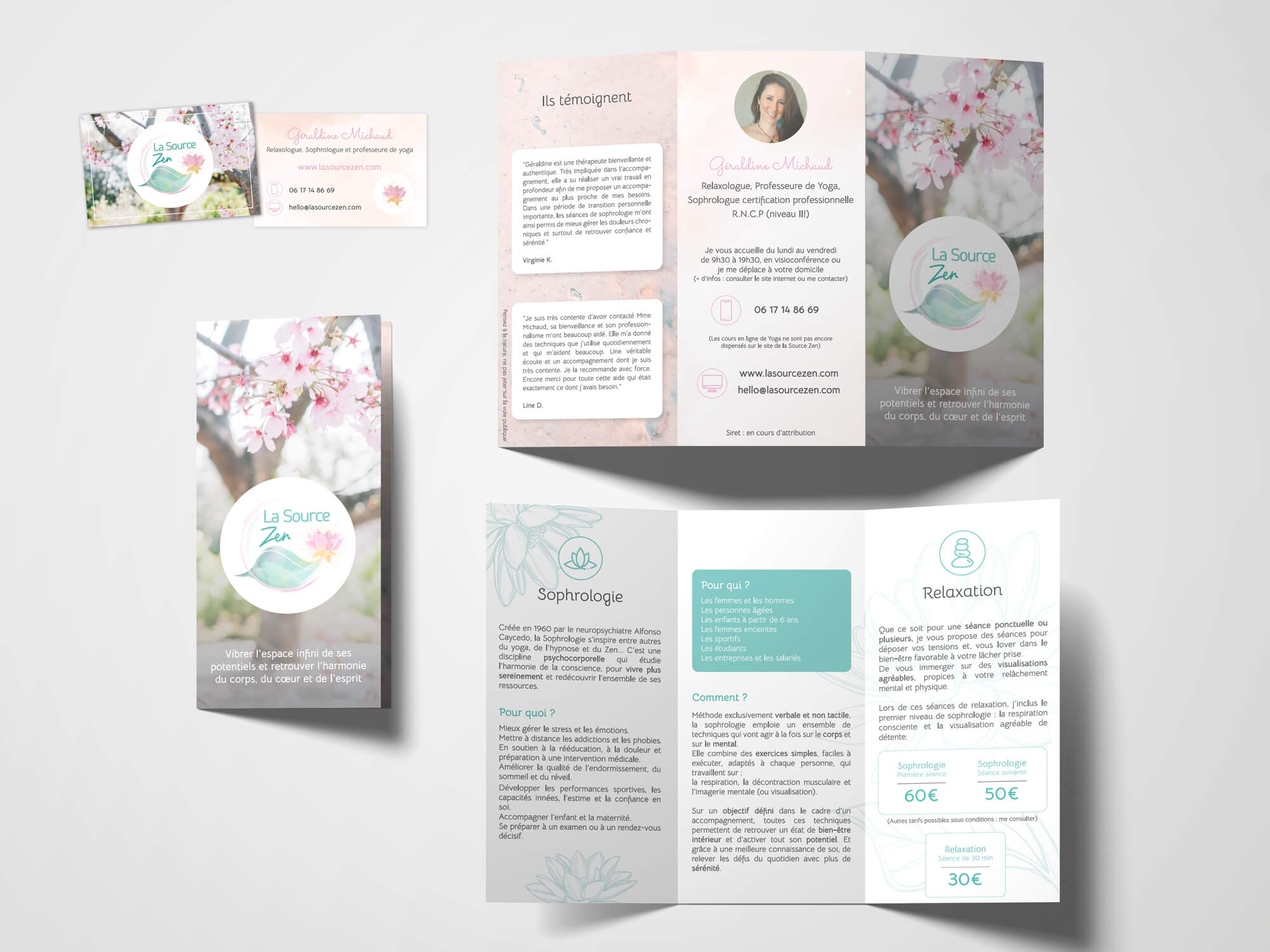 Pour finir, nous avons complété sa communication visuelle par des cartes de visite ainsi qu’un dépliant en 3 volets pour présenter ses services.